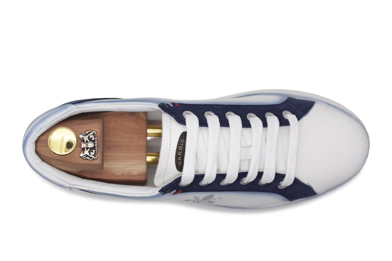 Sneaker in pelle effetto alce bianca sfumata con inserti in camoscio blu. Il Giglio Fiorentino ricamato in filo argento firma questo modello a cassetta leggera, costruito con cura in Blake Rapid.