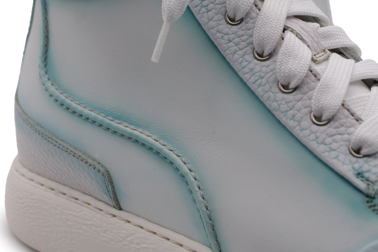 Morbidezza e freschezza si fondono in questa creazione in vitello sfumato a mano. I dettagli in suede writer si accendono con sfumature celeste, offrendo una variante moderna e luminosa alla classica suola in gomma a cassetta.