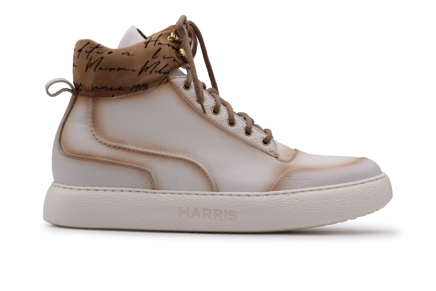 Stiefeletten aus weichem weißem Leder mit schattierten Details und Einsätzen aus feinem Writer-Wildleder in der Farbe Tiffany. Ein heller Sneaker, angereichert mit Nickel-Accessoires für ein klares und modernes Design.