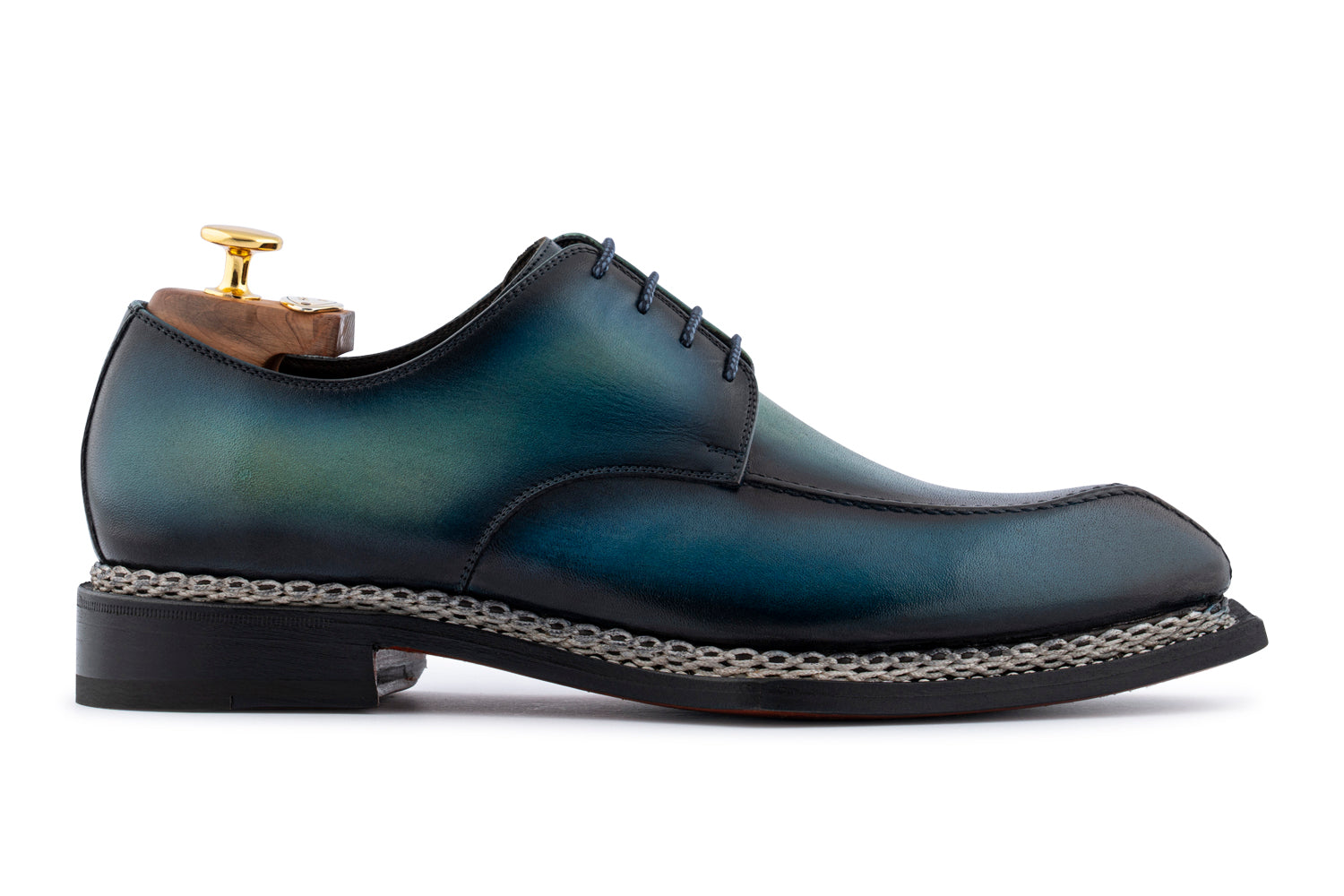 This derby model, made of full -flowered veal leather, is hand -painted for an exclusive and artisan result. Derby lacing and Norwegian processing enhance its quality and robustness, giving the model a solid structure and a timeless charm. Completed by a leather sole, it offers elegance, comfort and resistance.