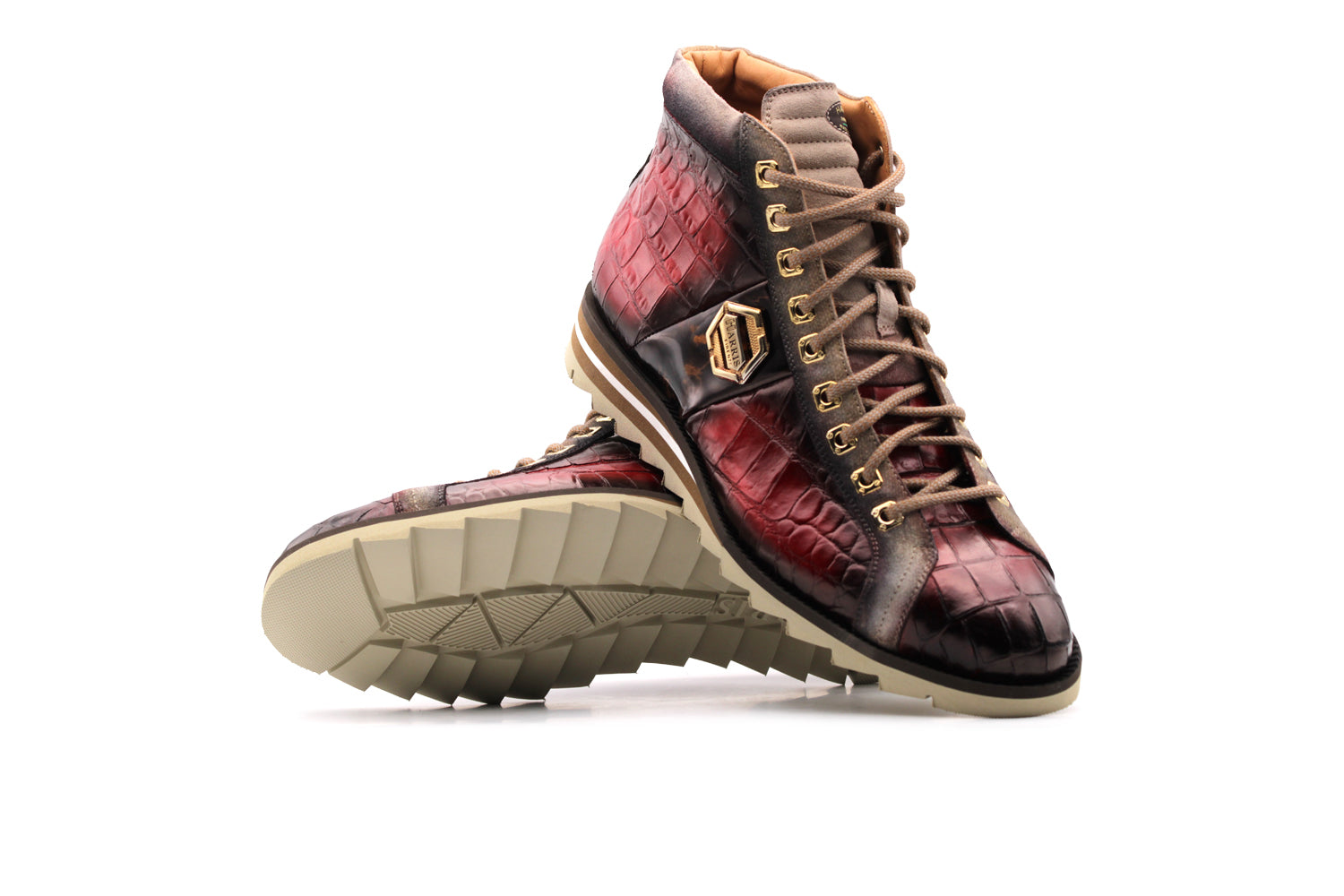 Depth and texture come together in this burnt brown crocodile-print calfskin sneaker, hand-painted for a unique effect. The side details Testa di Moro they dialogue with the softness of the shaded beige suede on the heel, tongue and lacing. Gold accessories for a classy finish.