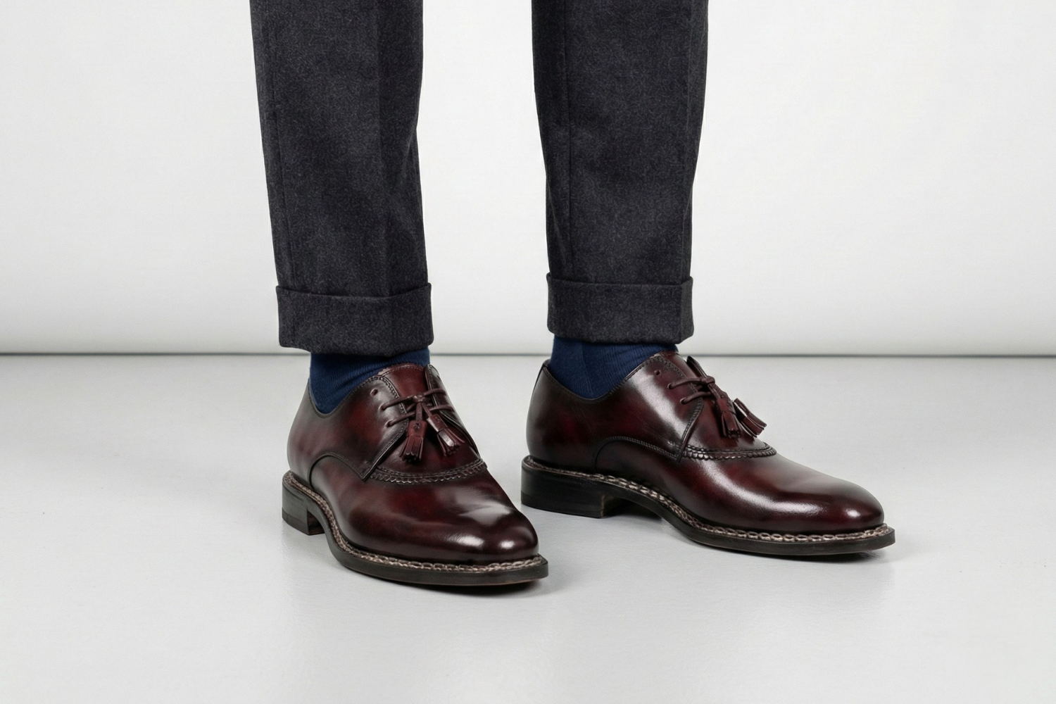 Derby in hand-painted calfskin, handcrafted stitching on the upper and leather sole with non-slip insert. A shoe that tells a story of passion and technique.