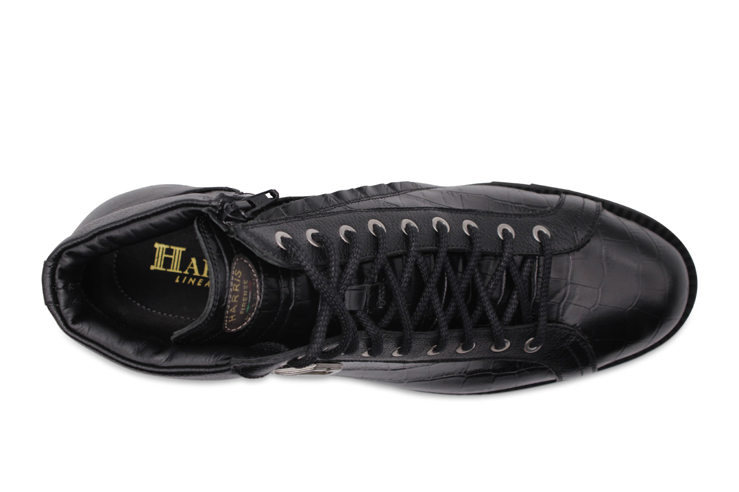 Piel de becerro plena flor estampada efecto cocodrilo con detalles en piel efecto alce negra, accesorios en níquel y suela tipo corredor. Un icono de estilo urbano y elegancia atemporal.