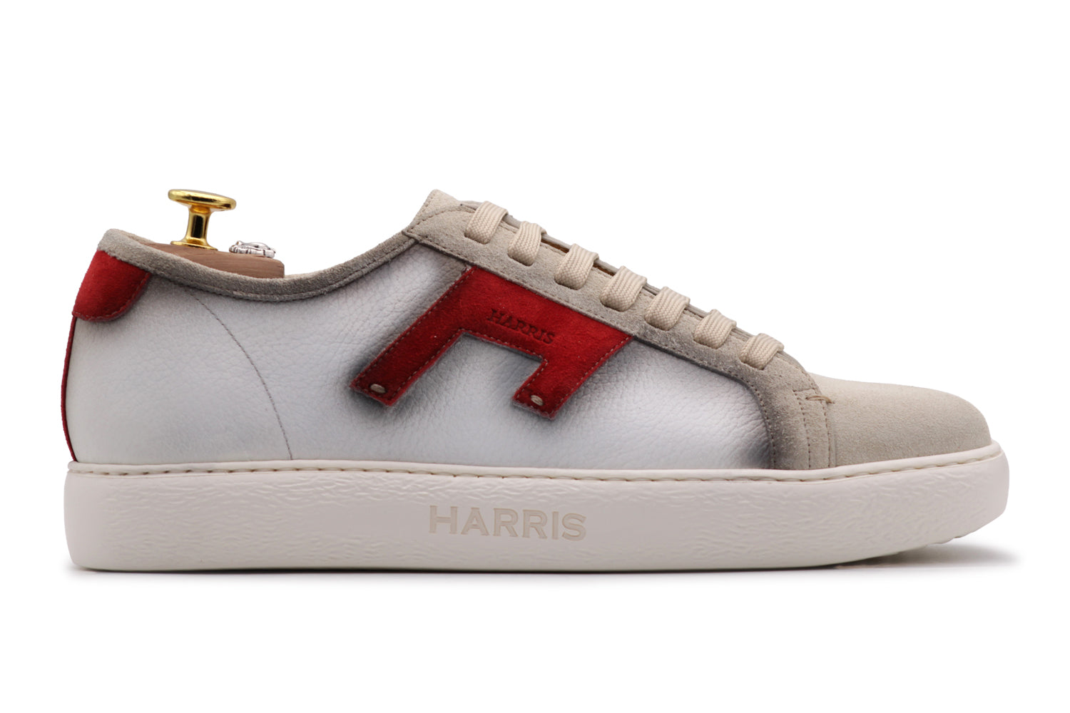 Sneaker in pelle effetto alce bianca con riporti in suede sabbia e dettagli in suede verde. Sfumata interamente a mano e montata su suola a cassetta leggera con lavorazione Blake Rapid.