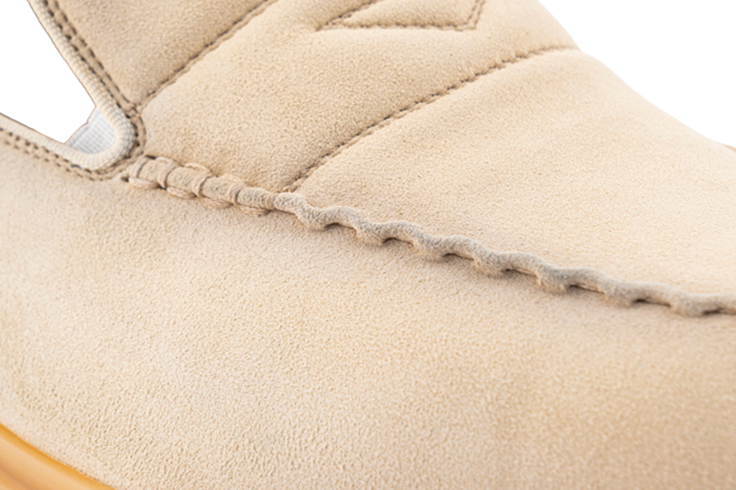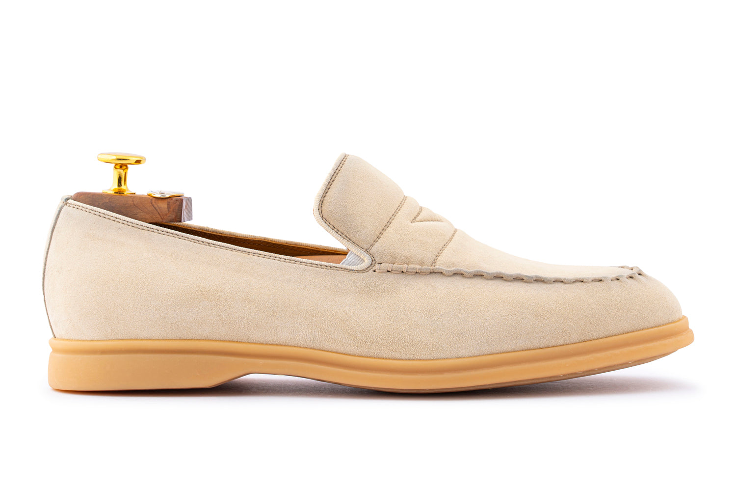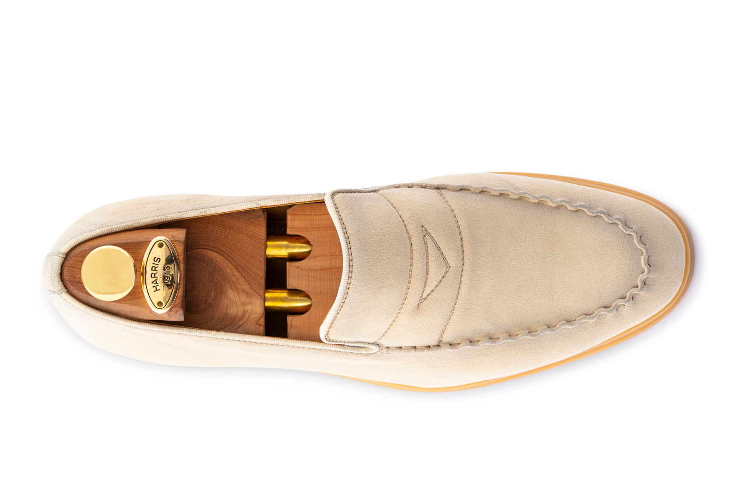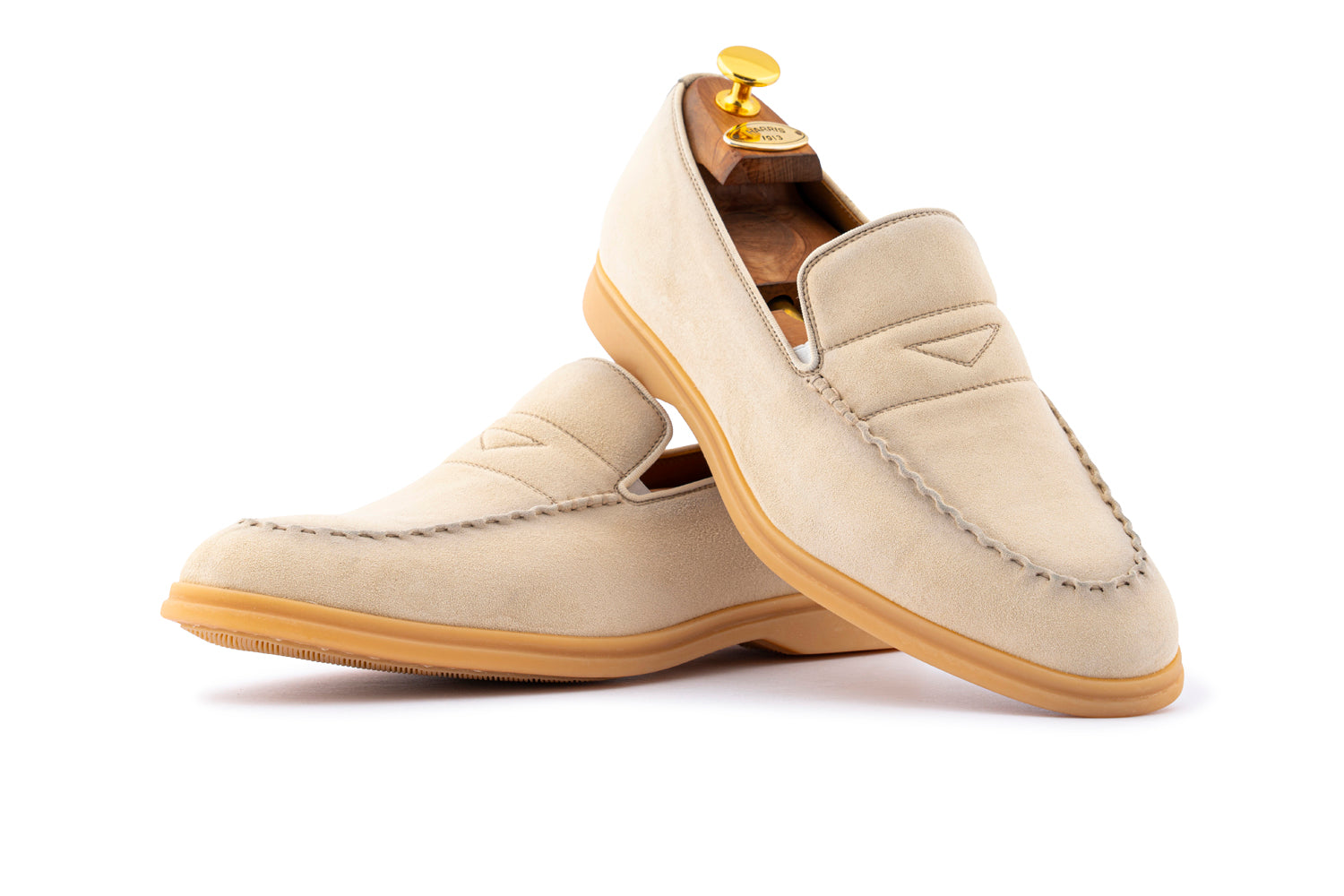 Pelle scamosciata color avorio con dettagli cuciti interamente a mano e passante imbottito per un comfort assoluto. La suola in gomma leggera color miele si sposa perfettamente con la solida lavorazione Blake Rapid.