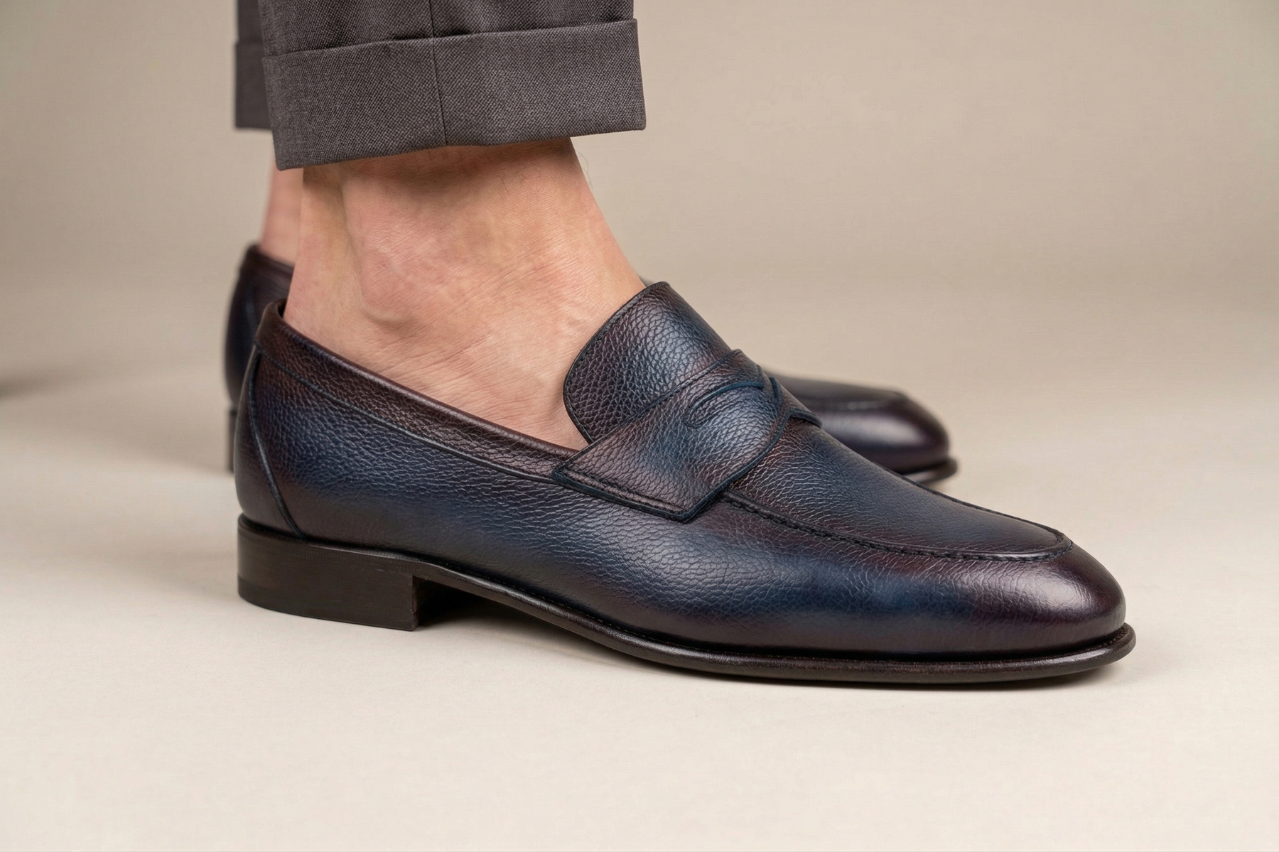 Mocassino sfoderato in morbidissima pelle effetto alce, dipinta a mano con profondi dettagli scuri. Leggerezza estrema grazie alla suola in cuoio e flessibilità garantita dalla lavorazione Blake Rapid.