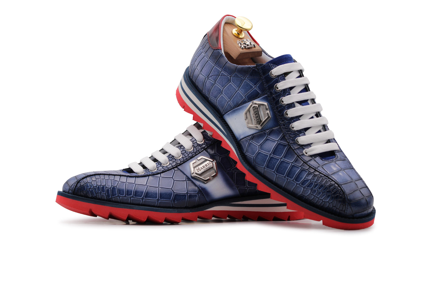 Questa sneaker combina la pregiata pelle di vitello spazzolata con stampa coccodrillo in un vibrante azzurro sfumato, illuminato da dettagli bianchi e un deciso tallone in pelle rossa. La suola runner assicura comfort dinamico, mentre gli accessori in nichel confermamo l'unicità di Harris.