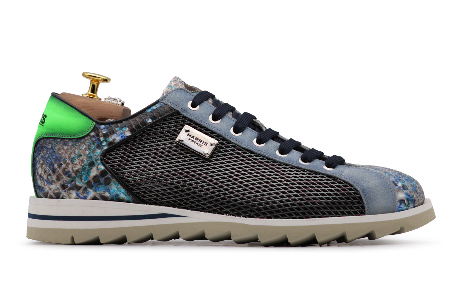 Un'esplosione di texture in rosso fumé: la pelle stampa traforato si unisce al prestigio del pitone su linguetta e tallone. I dettagli in suede sfumati a mano e gli accessori nichel rifiniscono una runner costruita con tecnica Blake Rapid, pensata per chi non vuole passare inosservato.