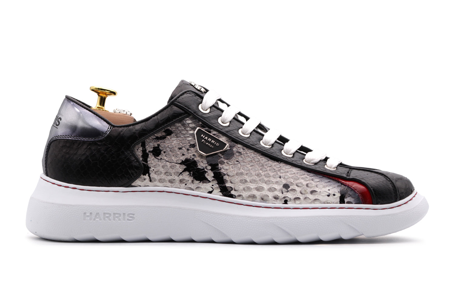 Sneaker in pelle morbida effetto alce, sfumata a mano per esaltarne la profondità dei toni. I riporti in pelle stampata effetto coccodrillo creano un raffinato gioco di texture che racconta cura e carattere. Completano il modello gli accessori in nichel e la suola in gomma a cassetta, per un equilibrio perfetto tra artigianalità, comfort e stile contemporaneo.